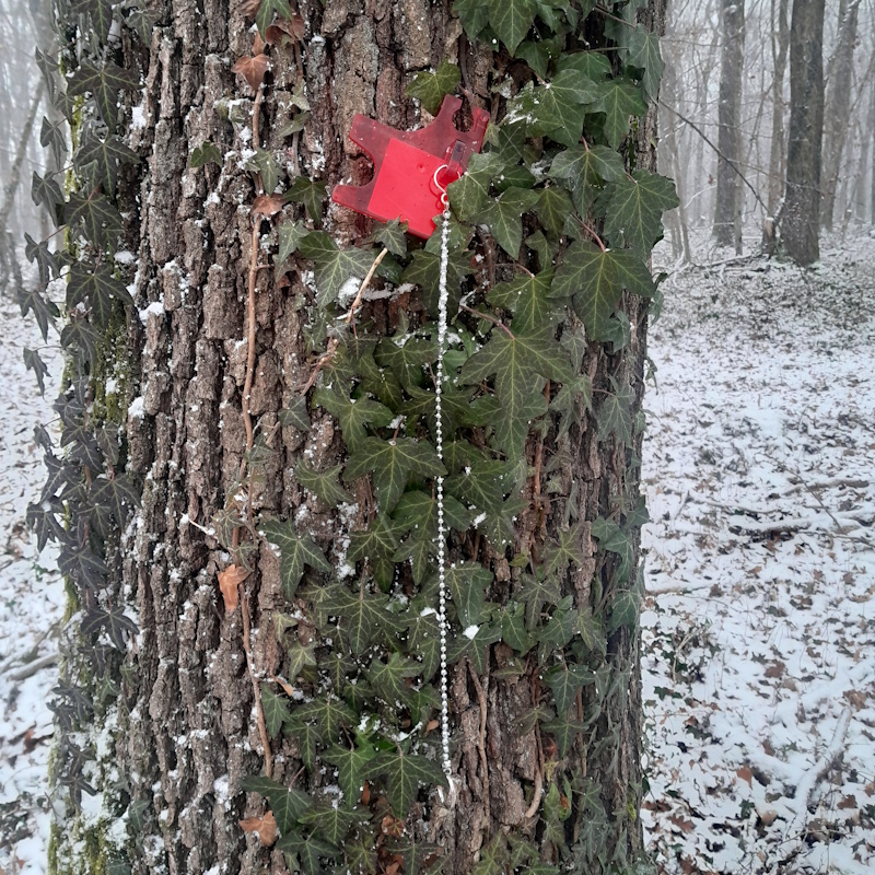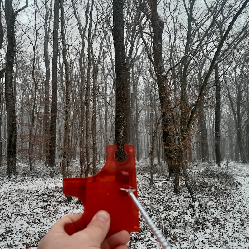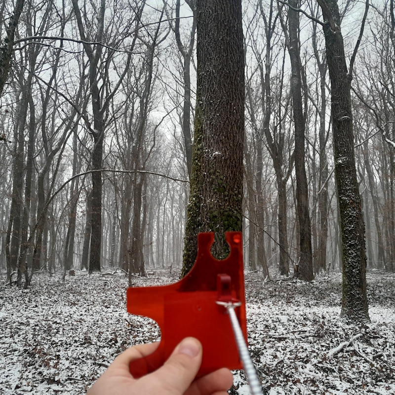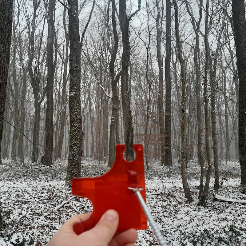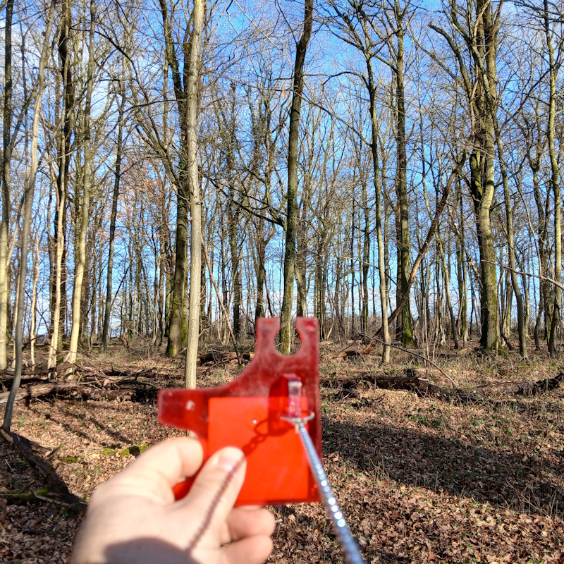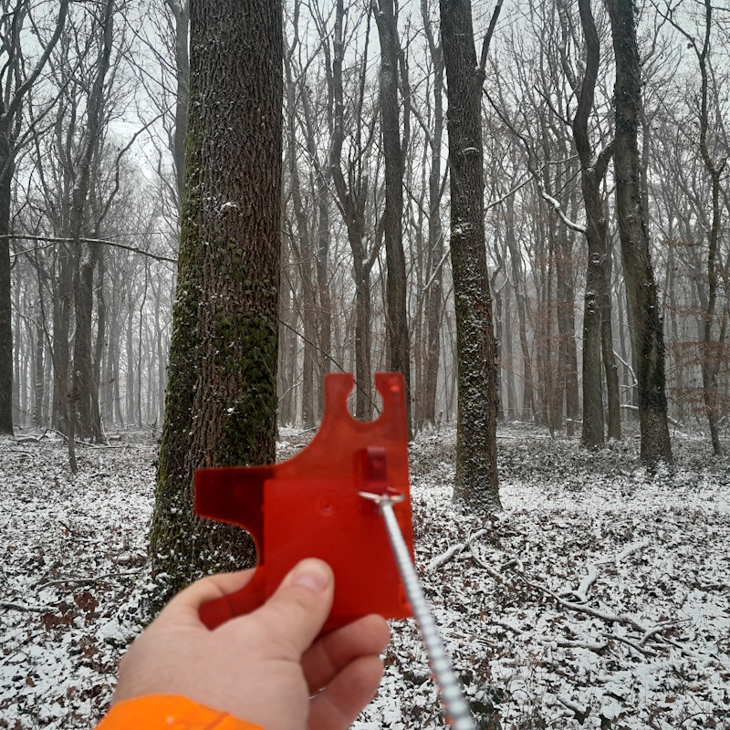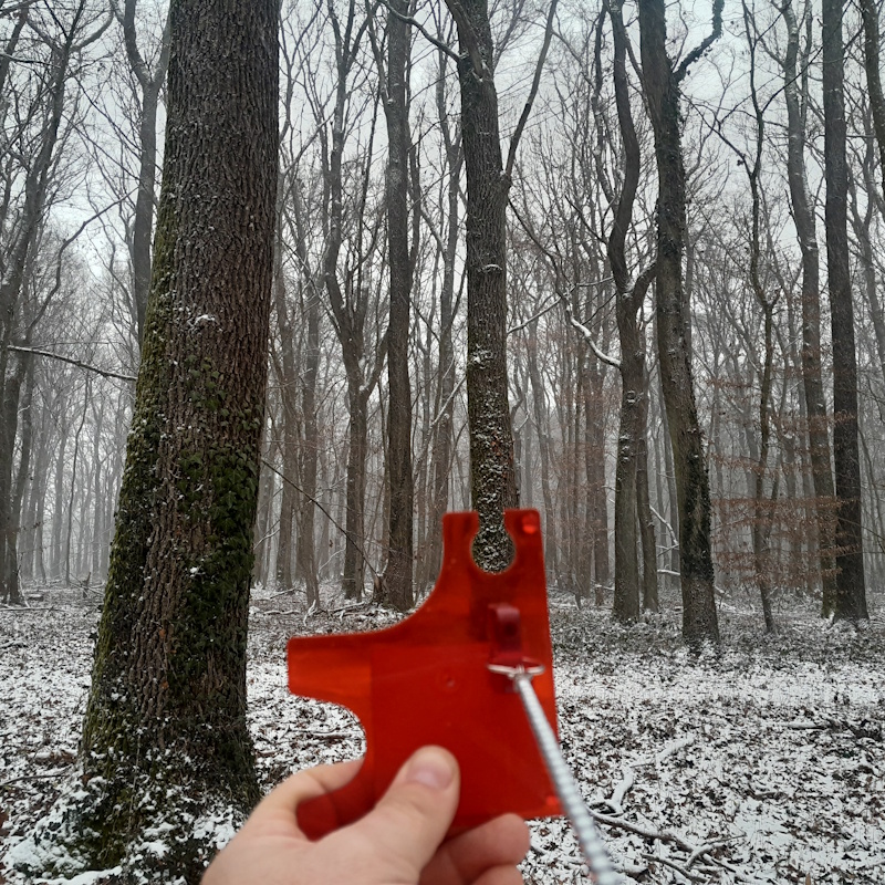 Pour mesurer une surface terrière, on a besoin d’une encoche relascopique : elle est constituée d’un fil de 50 cm auquel est fixée une plaquette percée d’une encoche de 1 cm de large.