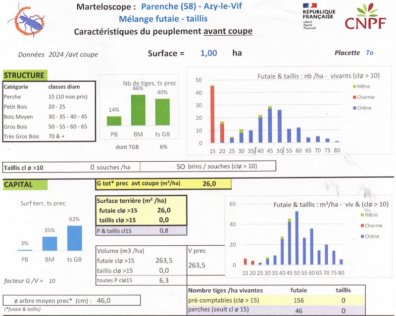 Le peuplement est un mélange futaie-taillis chêne-charme très riche, la surface terrière dépasse 20 m²/ha. Les classes de diamètres dominantes sont 40, 45 et 50 cm, on note un déficit en Petits Bois.